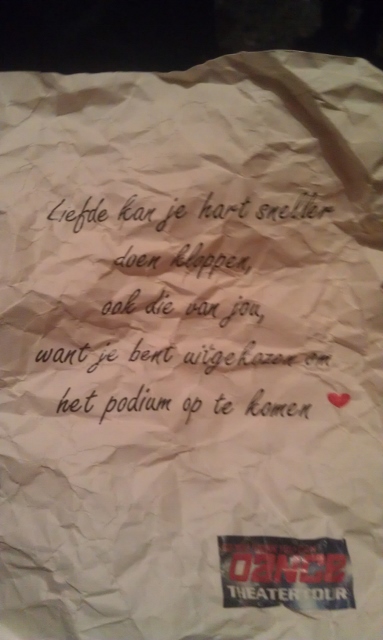 ’s Avonds, na de opnames ging ik met mijn oom en moeder ook nog naar So You Think You Can Dance theater tour. Mijn dag was helemaal compleet. Ik zat op de tweede rij. Ik had goed uitzicht, en we hadden leuk contact met Roy Julen. Helaas was ik net te laat met het papiertje vangen om het podium op te klimmen, maar anders had ik zelfs nog een privédans gehad van Gio. Maar volgend jaar beter!