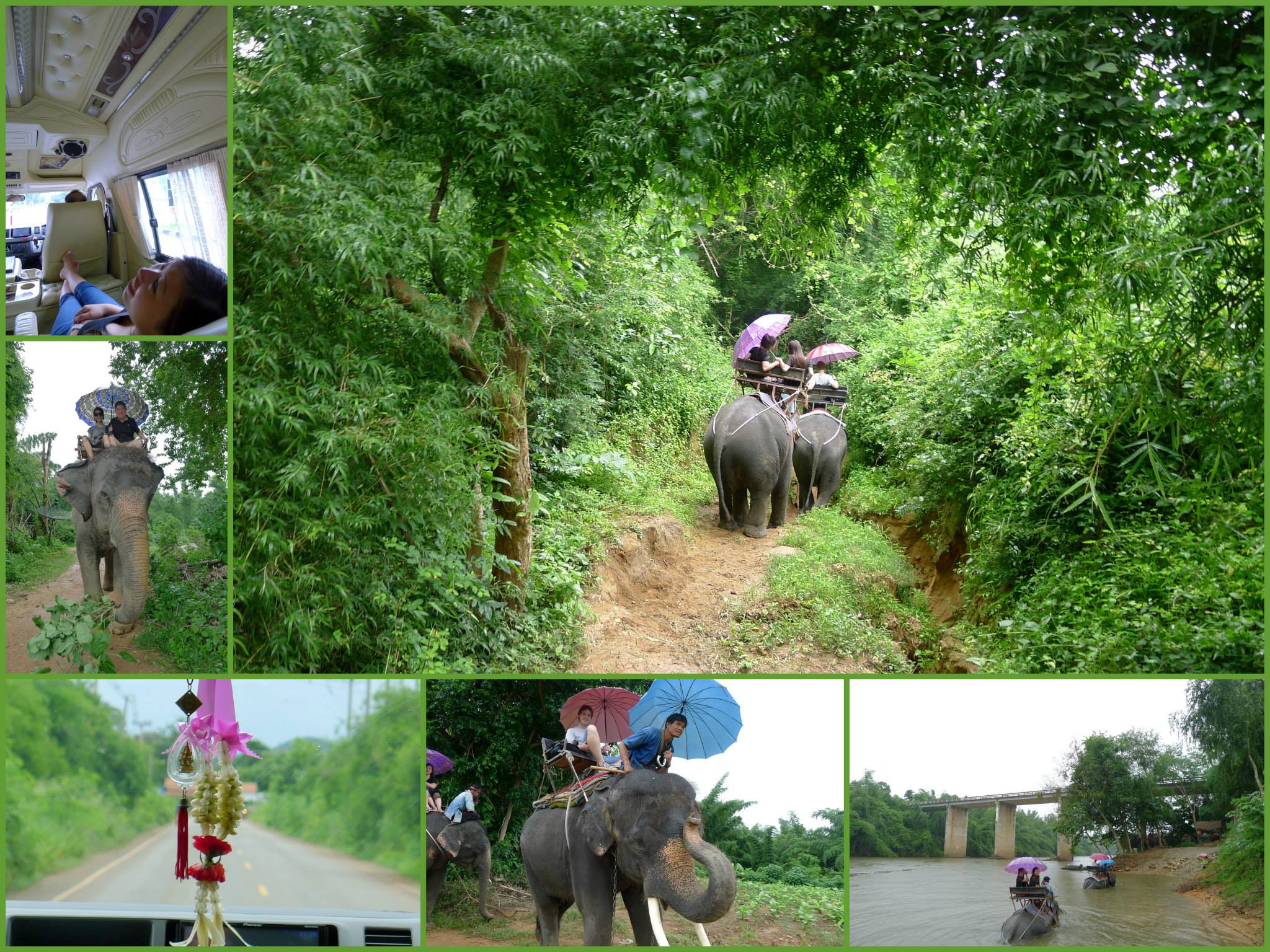 Dag 3, we gingen naar de Olifanten en Tiger Temple in Kanchanaburi. We hadden wel een big-ass busje voor ons vijven. Met luxe speakers, luxe stoelen die naar achteren konden en prachtig ingericht. We gingen eerst een ritje maken op de olifanten. Erg leuk, een ritje door de jungle. Het was nat en regenachtig, en we moesten een paraplu mee. Maar je moest je ook goed vasthouden, want we liepen door de jungle en door het water met de olifanten, dus het was één groot avontuur!